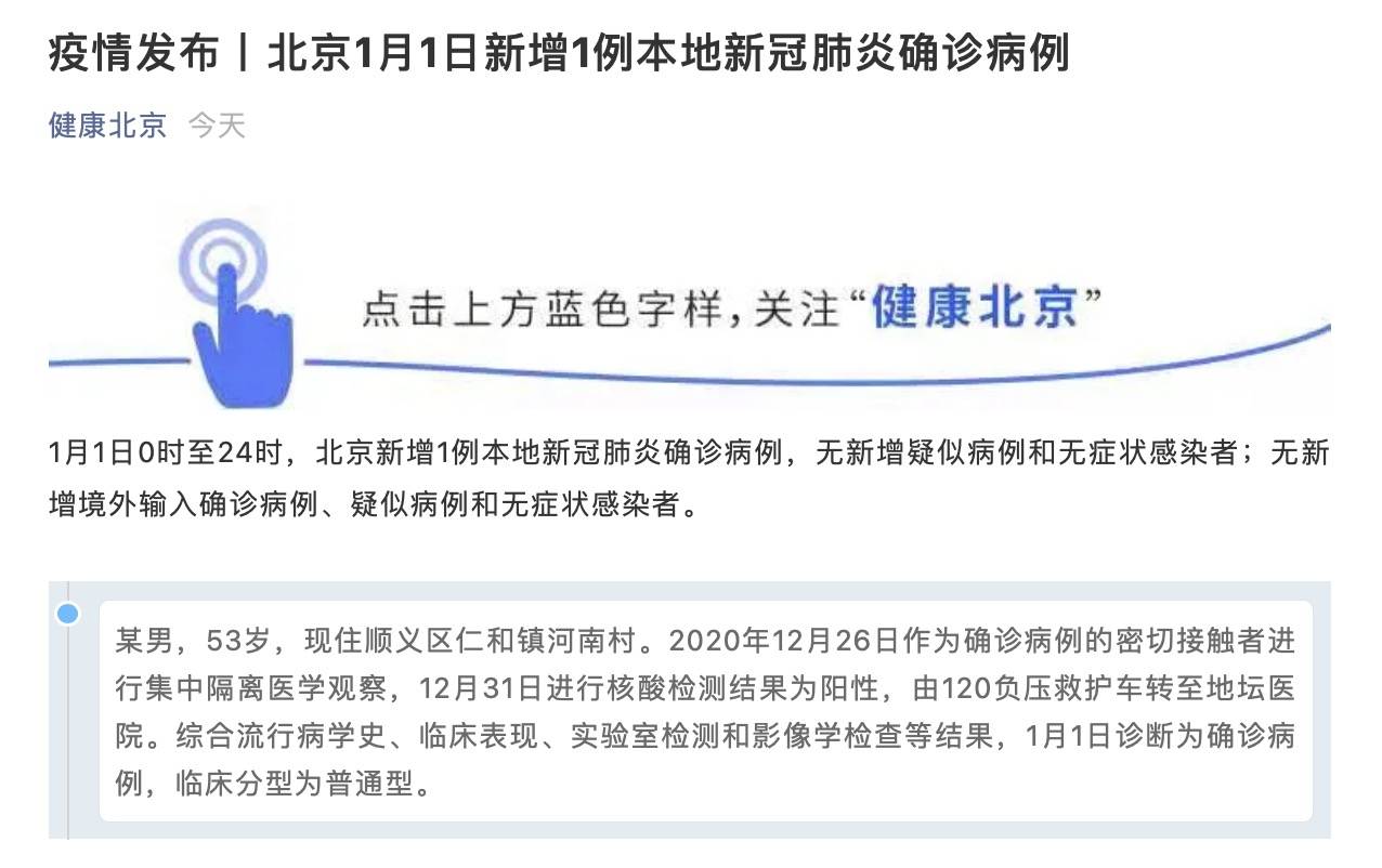 1月1日0:00-24:00,北京新增1例局部新冠肺炎肺炎确诊病例,无新增疑似病例和无症状感染者;没有新输入的确诊病例、疑似病例和无症状感染者。