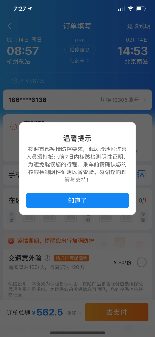 2月6日下午,记者准备通过旅行APP购买2月14日杭州东到北京南的高铁车票。提交订单前,系统自动弹出提示信息:根据首都疫情防控要求,低危区进京人员必须在到达北京前7天内持核酸检测阴性证明。为避免耽误行程,请确认您的核酸检测阴性证明后再乘车检查。